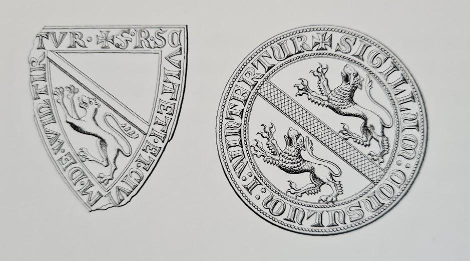 Bereits 1252, noch vor dem Aussterben der Grafen von Kyburg, siegelte die Stadt Winterthur mit einem Wappen, das vom Wappen der Kyburger abgeleitet war, unter Weglassung des oberen Löwen. Um 1276 verwendet der Schultheiss Wezel von Winterthur dann das Wappen der Kyburger, also inklusive des oberen Löwen. Daraus lässt sich schliessen, dass Rudolf von Habsburg, der zu dieser Zeit deutscher König war und 1275 das Erbe der ausgestorbenen Kyburger angetreten hatte, der Stadt erlaubte, das Kyburger Wappen als Stadtwappen zu führen.[30] Das Winterthurer Wappen ist das damit mit Abstand älteste Gemeindewappen im Kanton Zürich. Das Zweitälteste ist jenes von Grüningen, das 1370 erstmals aufgetaucht ist.[31]